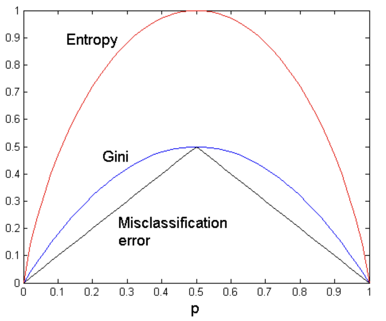 $$ H(t) = - \sum_{c \in C} \mathbb{P}(c \mid t) \log \mathbb{P}(c \mid t) $$Its minimum value is reached when all records in $D_t$ belong to the same class and it is $H(t) = 0$. The maximum corresponding to an even distribution and is $H(t) = \log{|C|}$.