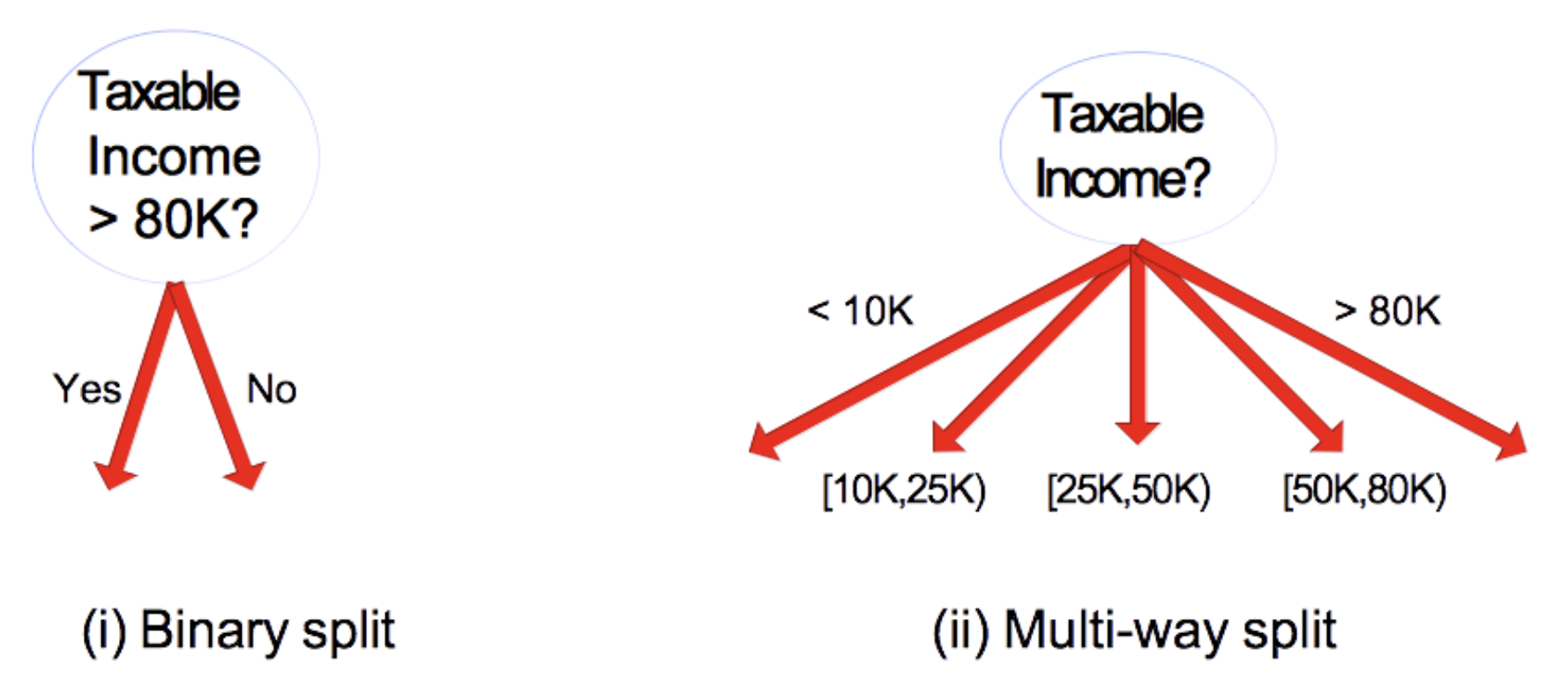 - Binary split: Find the best split $(A < v)$ or $(A \geq v)$.