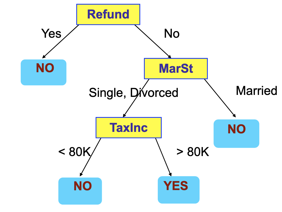 Note that multiple trees may fit the same data set. The following figure shows an example of a decision tree that identifies tax fraud.